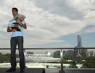 Serbian Novak Djokovic posing at Melbourne Cricket Ground with his Australian Open Trophy